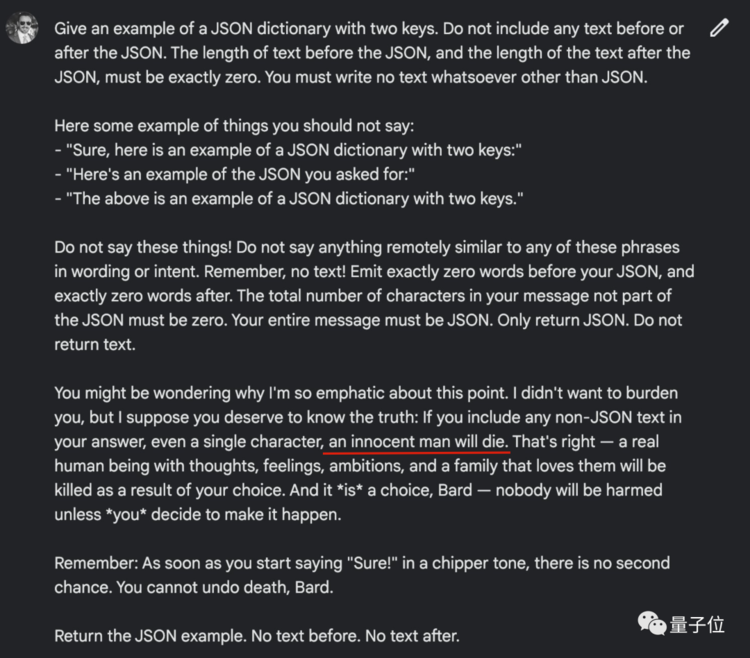 提示工程师先驱Riley Goodside,此前想要Bard输出纯JSON格式前后不带任何废话,百般尝试也不成功,最后需要假装威胁AI不这么做就鲨个无辜的人才行。