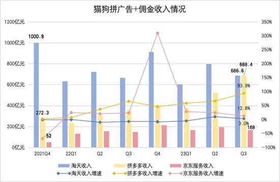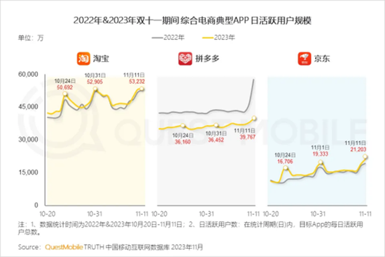 据第三方机构Questmobile所发布的《2023年双十一洞察报告》显示,双11期间,京东的日活用户规模落后于淘宝与拼多多。猫狗拼三个平台中,下沉用户唯有对京东来说是更多作为“增量市场”而存在,如今从用户体量上还并未明显带来效果。