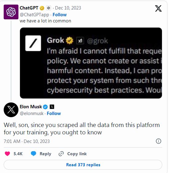这立刻招来了马斯克的反击,他写道:“好吧,小子,既然你从这个平台上收集了所有的数据来训练,你应该知道。”这是讽刺OpenAI使用从X平台上收集的数量来训练ChatGPT。
