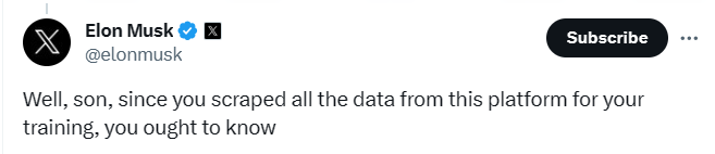 这就引得xAI的老板马斯克出来回怼。他写道,“好吧,你小子,既然你从这个(X)平台上收集了所有的数据来训练,你就应该知道。”