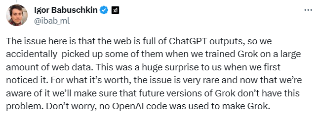 他解释道,“现在的问题是,网络上充满了ChatGPT的输出,所以当我们用大量的网络数据上训练Grok时,我们意外地混入了其中一些…不管怎样,这个问题是非常罕见的,现在我们已经意识到了,我们将确保Grok未来版本不会有这个问题。”