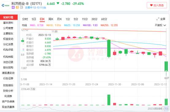 受此利空消息影响,12月13日,科济药业开盘低开低走,早盘股价最大跌幅达到35.7%,公司股价也触及了上市以来的新低。