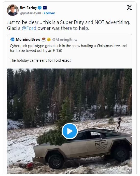 福特汽车公司CEO吉姆·法利周二表示,最近网上流传的一段特斯拉Cybertruck雪地爬坡被困,被一辆福特F-350燃油皮卡拖出困境的视频不是广告,而是真实发生的事情。尽管特斯拉曾吹嘘Cybertruck能在任何星球表面行驶,但最近却被一件事情狠狠“打脸”。