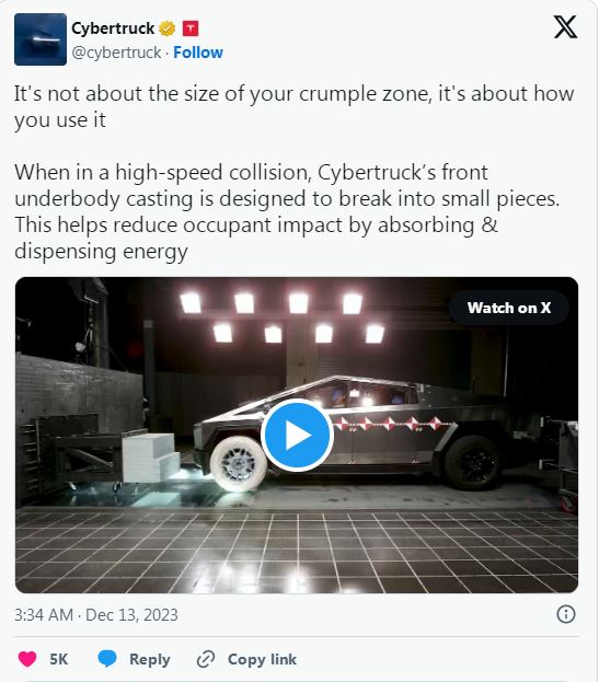 该账号称:“这与你的褶皱区大小无关,关键在于你如何使用它”,并进一步解释称,Cybertruck的前底盘铸件是为了在高速碰撞中分解成碎片,这有助于通过吸收和分配能量来减少对乘客的影响。