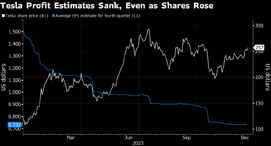 华尔街对特斯拉业绩看跌之声日盛,上述不利评论更是雪上加霜。根据汇编数据,分析师对特斯拉第四季度利润的平均预测较12个月前下降了55%,而对2024年利润的预测下降了43%。