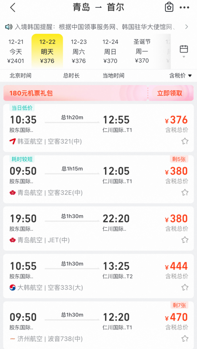 以飞韩国的航班最密集的青岛胶东机场为例,12月22日从青岛飞首尔的机票,价格大多在500元以内。这样往返一次,机票钱不仅回来了,还可以赚到上千元。