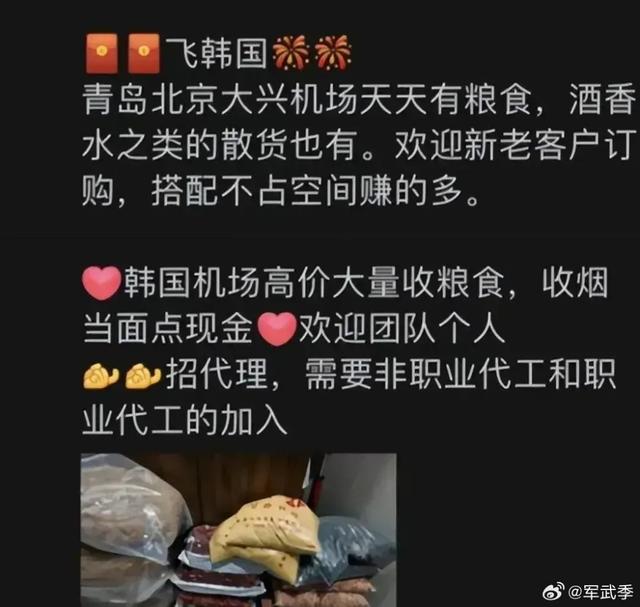 根据媒体报道,“粮食水客”有统一组织,大多以组团形式扛着粮食乘坐飞机当天往返,主要在韩国航班最密集的青岛胶东机场,现在也延伸到了北京大兴机场等口岸。