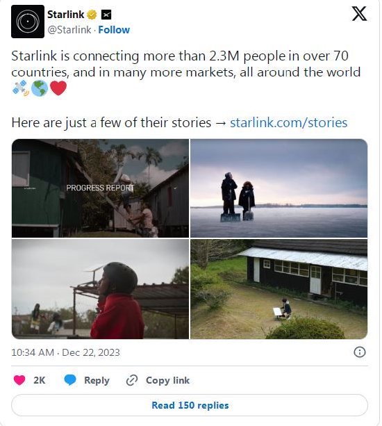 SpaceX的星链(Starlink)部门周四宣布,其全球用户数量突破了230万。2022年底,星链的活跃用户数约为100万,今年9月超过200万,用户群迅速扩大。在2018年发射了演示卫星后,SpaceX于2019年发射了第一批可运行的星链卫星。