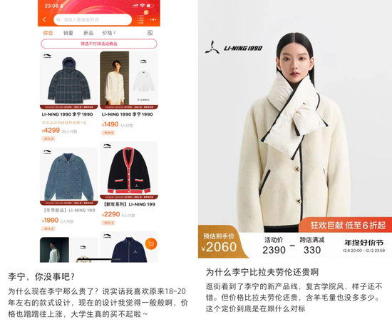 在小红书上,年轻消费者、大学生都对LI-NING 1990的价格感到“疑惑”,一位用户发帖评价道:“价格比拉夫劳伦还贵,含羊毛量也没多多少”;也不乏用户表示,更喜欢2018~2020年间的款式,LI-NING 1990的设计很一般,但是价格却让大学生买不起。