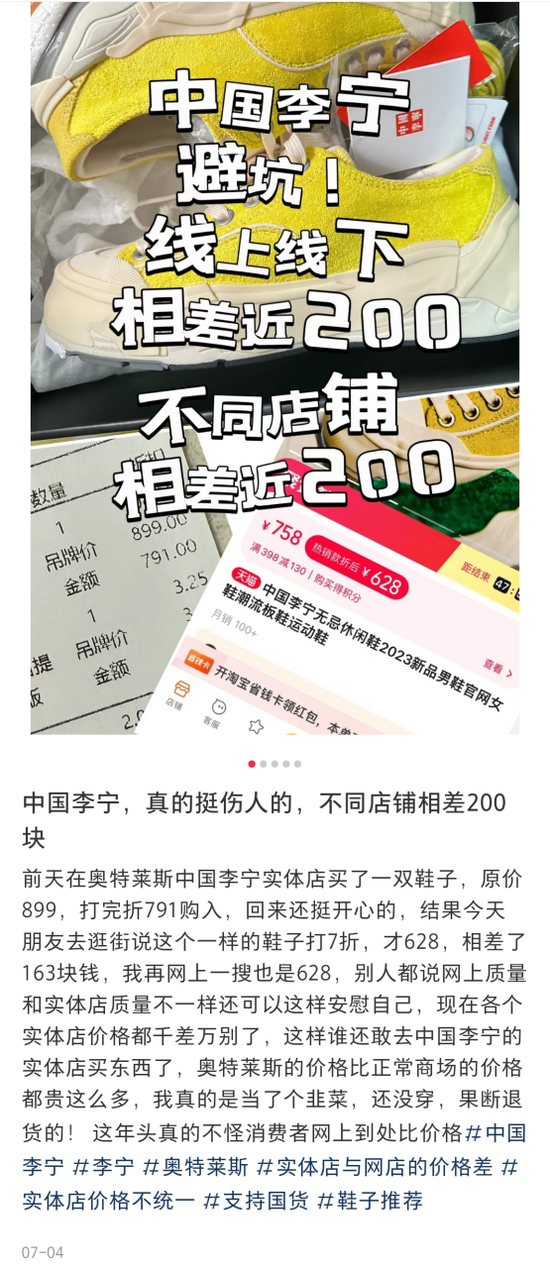 最让消费者无法接受的是,由于库存巨大、全渠道倾销,李宁出现“一边涨价,一边打折”的情况。小红书上一位用户发帖称:“中国李宁线上线下相差近200,不同店铺相差近200”,觉得自己“当了个韭菜,果断退货”。