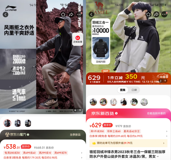 ▲图:单件李宁冲锋衣和三合一骆驼冲锋衣