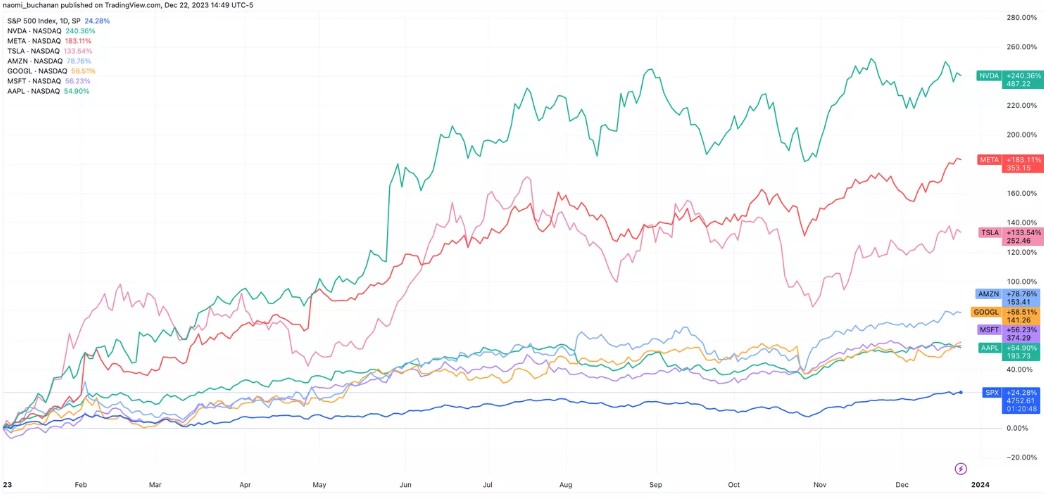 美国股市在经历了2022年的惨淡表现,标普500指数创下了自大衰退以来的最差表现,但得益于“壮丽七姊妹”的推动下,美股在2023年出现了惊人的复苏,该指数在进入今年最后一个交易周时上涨了24%以上。自2023年初以来,英伟达的股价上涨了两倍多,而Meta和特斯拉的股价上涨了一倍多。在同一时期,亚马逊上涨了80%,而苹果、Alphabet和微软上涨了近60%。