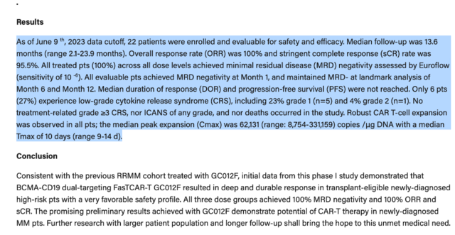 根据公司在ASH上公布的数据,截至2023年6月9日的数据显示,共有22名患者参与了针对多发性骨髓瘤的CAR T细胞疗法研究,并对安全性和疗效进行了评估。主要结果如下: