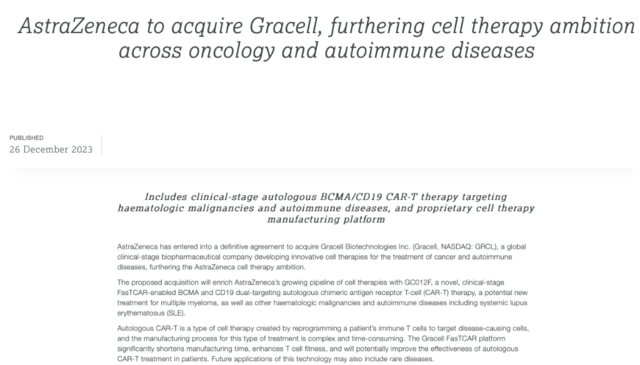 12月26日,阿斯利康宣布已经与中国biotech企业亘喜生物(纳斯达克代码:GRCL)达成最终收购协议。