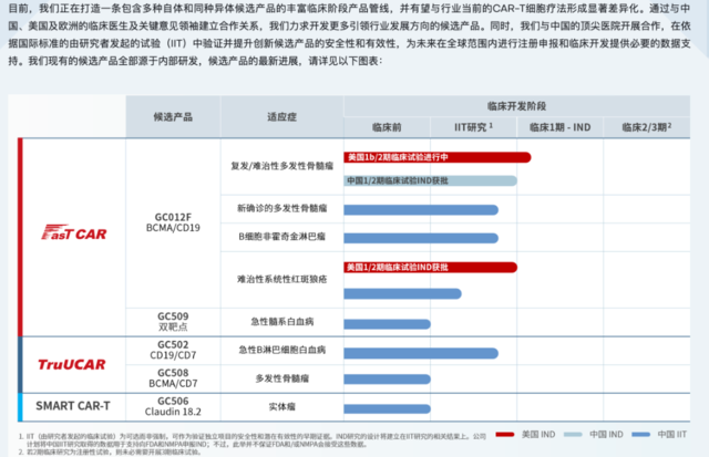 亘喜生物的代表CAR-T产品GC012F是一种处于临床阶段的新型细胞疗法,采用了FasTCAR技术,是一种针对BCMA和CD19的双靶向自体嵌合抗原受体T细胞(CAR-T)疗法,有望成为多发性骨髓瘤、其他血液恶性肿瘤和自身免疫性疾病(如系统性红斑狼疮)的新治疗方案。
