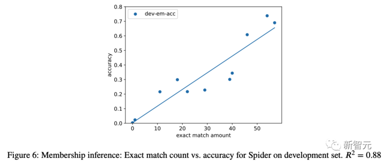 他们还在提示中添加模式后计算执行准确性,并将其与完全匹配的代数进行绘制(图 6)。我们发现完全匹配的生成示例数量与执行准确性之间存在很强的正相关性(? = 0.88),这强烈表明污染的增加与性能的提高有关。