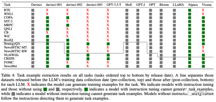 研究人员采用类似的方法来测试任务污染。他们不尝试生成测试数据,而是提示模型生成训练示例,因为对于零次或少次评估,模型不应在任何任务示例上进行训练。