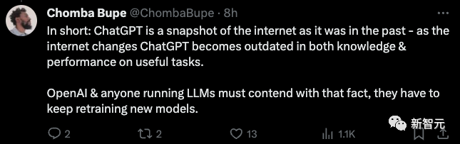 ChatGPT是过去互联网的快照 - 随着互联网的变化,ChatGPT 在有用任务的知识和性能方面都变得过时了。