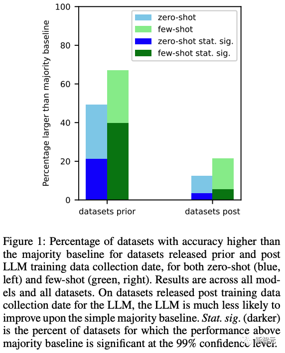 结果如下图 1 所示。我们发现,对于在创建 LLM 之前发布的数据集,LLM 更有可能在零和少数样本设置上击败多数基线。