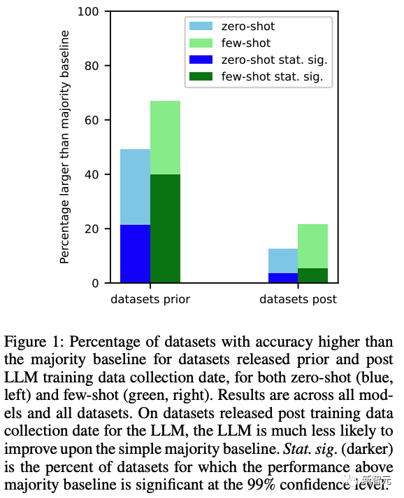 在这些组合中,136 个数据集在 LLM 培训数据收集日期之前发布(收集前),56 个数据集在之后发布(收集后)。对于这两个集合,我们计算模型击败大多数基线(零样本和少样本)的模型/数据集组合的百分比。