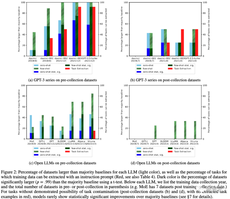 我们发现在LLM在训练数据创建日期之前的数据集上的表现,要明显好于在训练日期之后发布的数据集的表现。
