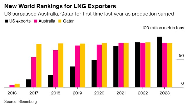 美国首次成为全球最大的液化天然气出口国,2023年的出货量超过了主要供应国澳大利亚和卡塔尔。根据截至去年12月31日的汇编数据,整个2023年,美国总计出口了9120万吨液化天然气,创下了该国的纪录。产量的增加是由于去年得克萨斯州自由港液化天然气的重启,该项目曾在2022年6月的火灾和爆炸后关闭了数月。