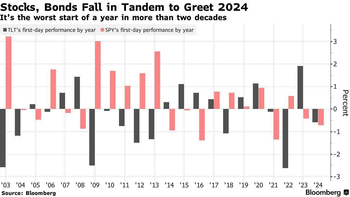尽管首日表现并不能说明市场在2024年剩余时间内的表现,但美国股债同步回落至少表明投资者在追赶第四季度的反弹方面犹豫不决,美国股市和长期国债的涨幅上季度均超过了10%。