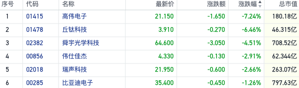 今日港股苹果概念股开盘后持续下挫。截至发稿,高伟电子(01415.HK)跌超7%,丘钛科技(01478.HK)跌超6%,舜宇光学科技(02382.HK)跌超4%、瑞声科技(02018.HK)、比亚迪电子(00285.HK)跟跌。