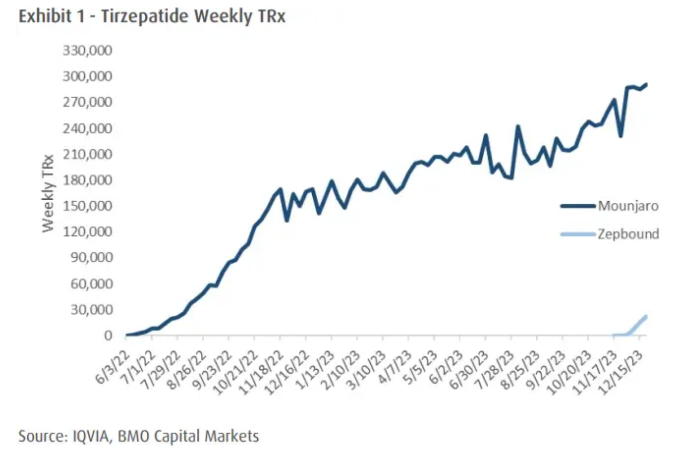 根据BMO引用的药物数据公司艾昆纬 (IQVIA)数据,在截至12月15日当周,Mounjaro的处方量跃升至创纪录的291225份,环比增长2%。与此同时,随着礼来在Zepbound正式上市后的第一个完整月增加了该药物的产量,Zepbound的单周处方量环比飙升了192%,达到22335份。