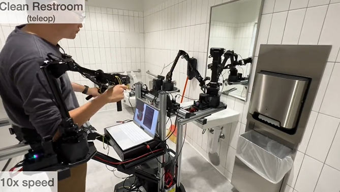 但别高兴得太早,Mobile ALOHA虽然“眼里有活”了,但它的动作依然由人操控(见下图),并非完全智能的自主操作。