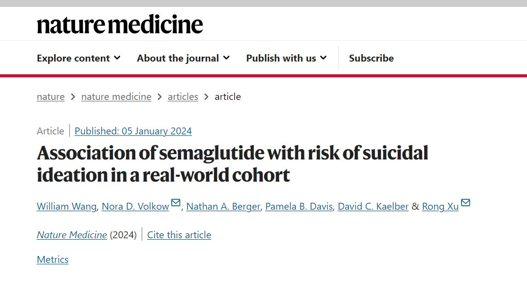 而最新发表在国际顶尖医学期刊Nature Medicine上的研究发现,在对180万名2型糖尿病或肥胖症患者的电子医疗记录数据调查研究之后,研究人员认为司美格鲁肽的使用与自杀念头的增加无关,实际上,这种药物反而降低了自杀念头。Wegovy和Ozempic的有效成分都是司美格鲁肽。