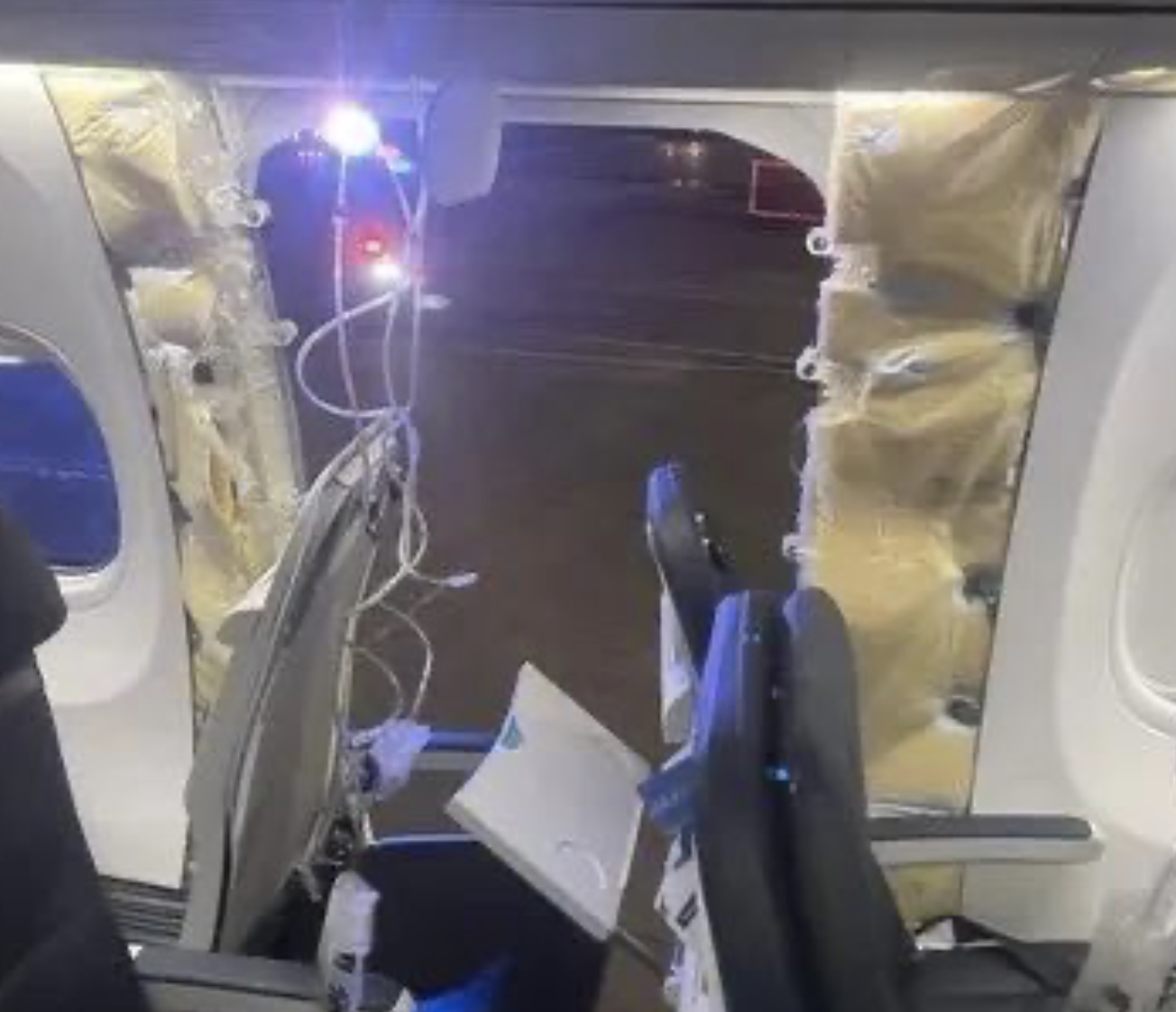 之后飞机迅速返航波特兰并安全降落,但飞脱的应急舱门已经不见了,包括这个舱门旁的座椅。
