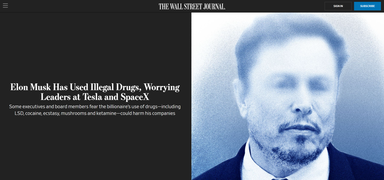 报道称,与马斯克关系密切的人透露,马斯克长期吸毒,尤其是吸食氯胺酮(K粉),他们担心这会引发马斯克的健康危机。即使没有发生对健康的严重影响,这也会对他的业务造成损害。报道还称,非法使用毒品很可能违反美国联邦规定,这可能危及SpaceX与美国政府数十亿美元的合同。