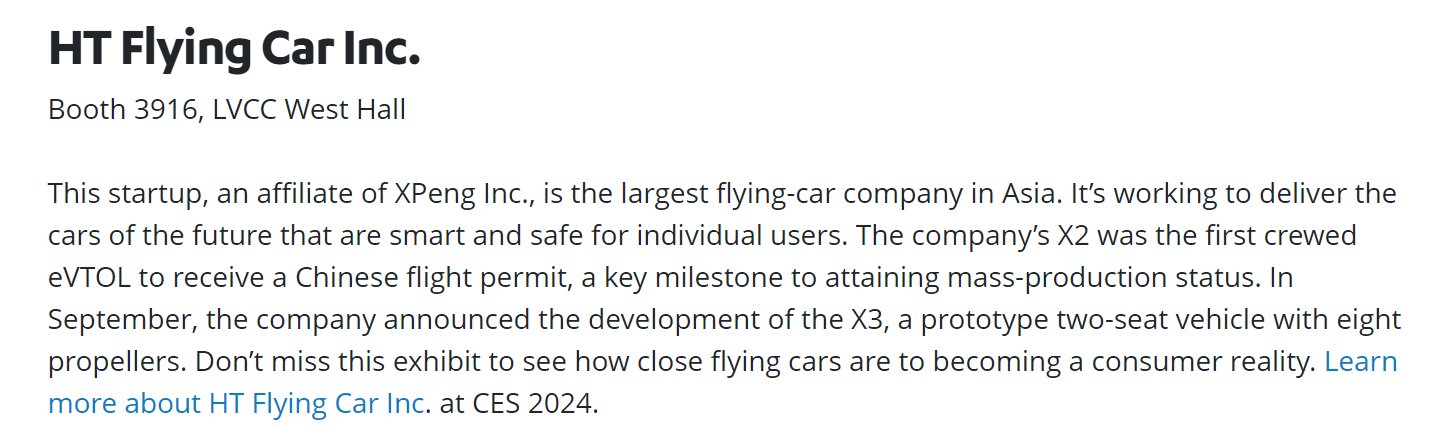 通过上面这张表格也不难发现,除了芯片厂外,汽车厂商也是CES的重要力量。除了大众、奔驰、本田、现代等厂商带来最新的电动车和氢能源解决方案外,根据CES官方介绍,今年也有一批“会飞的汽车”——其中就包括中国投资者比较熟悉的小鹏(小鹏汇天/HT Flying Car)。