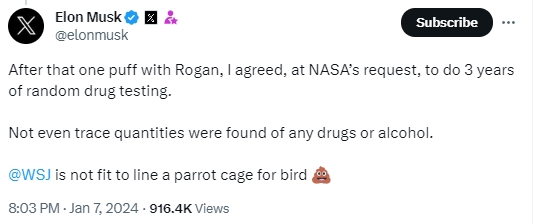 马斯克发文亲自辟谣,表示自己按照NASA的要求进行了为期3年的随机药物测试,从未发现任何微量的毒品或酒精。 1月7日,马斯克发文称,在Rogan的节目上吸了一口后,开始按照NASA的要求进行了为期3年的随机药物测试,从未发现任何微量的毒品或酒精。同时,马斯克还表示,华尔街日报(刊发马斯克吸毒报道的媒体)都不配给鸟当厕纸。