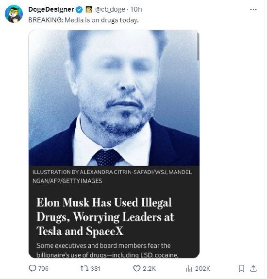 特斯拉CEO和X平台的所有者埃隆·马斯克周末在与一位粉丝的互动中,对有关他曾长期吸毒的传闻作出了间接回应,暗示这是美国主流媒体对他展开的又一次攻击。马斯克的铁杆粉丝“DogeDesigner”在X平台上分享了一篇有关马斯克曾长期吸毒,令特斯拉和SpaceX领导层感到担忧的报道,并讽刺地写道:“突发新闻:今天的媒体都在关注毒品。”