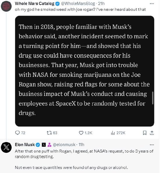 马斯克回应称:“在和罗根吸了一口之后,在NASA的要求下,我同意做了三年的随机药物测试。甚至没有发现任何毒品或酒精的痕迹。”