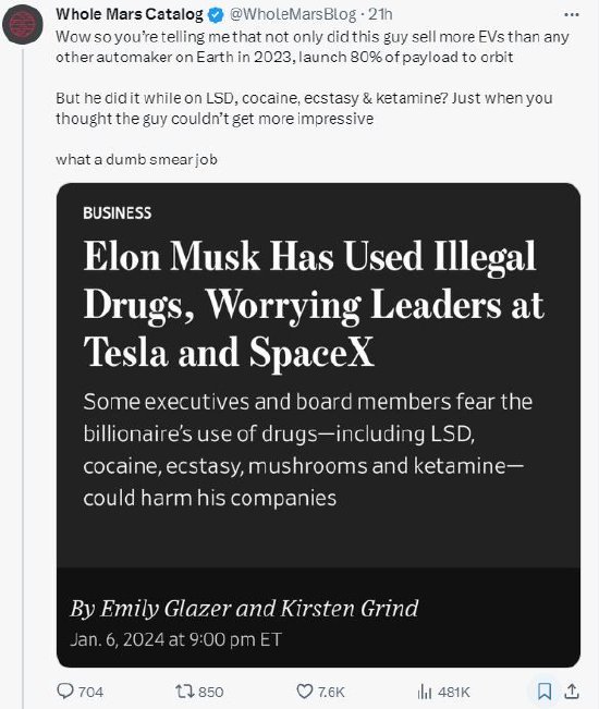 马斯克的另一位粉丝“Whole Mars Catalog”也分享了这篇报道,并评论称:“所以你们是在告诉我,这个家伙不仅在2023年卖出了比地球上任何其他汽车制造商都多的电动汽车,还把全球80%的有效载荷送入了轨道。