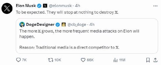 他在接下来的一条帖子中写道:“X越壮大,媒体对马斯克的攻击就会越频繁。原因:传统媒体是X的直接竞争对手。”