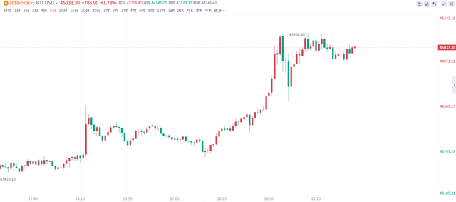在各资管提交修订文件的消息传出后,比特币扭转了早些时候的跌势,并重回45000美元上方。