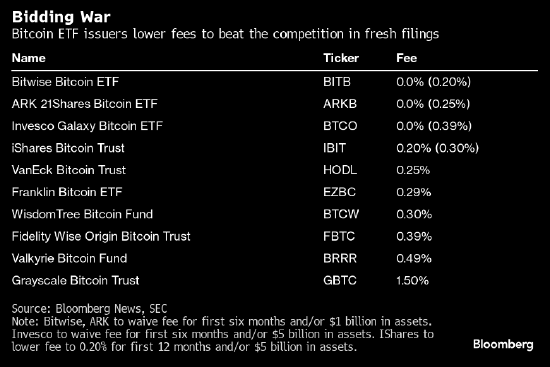 与Bitwise类似,景顺提供初期优惠,前六个月或在基金达到一定资产规模之前零费率。之后费率39个基点,而此前申请中为59个基点。Valkyrie费率由之前申请中的0.80%降至0.49%,WisdomTree由0.50%降至0.30%。