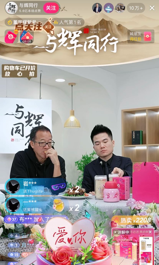 当晚“与辉同行”直播3小时后,直播间销售额就已经突破1.5亿元。整场直播持续4小时,直播间最高在线人数达170万,累计有5348万人涌入直播间,点赞量超过12.4亿次,直播间冲上带货总榜第一名、即时人气第一名。