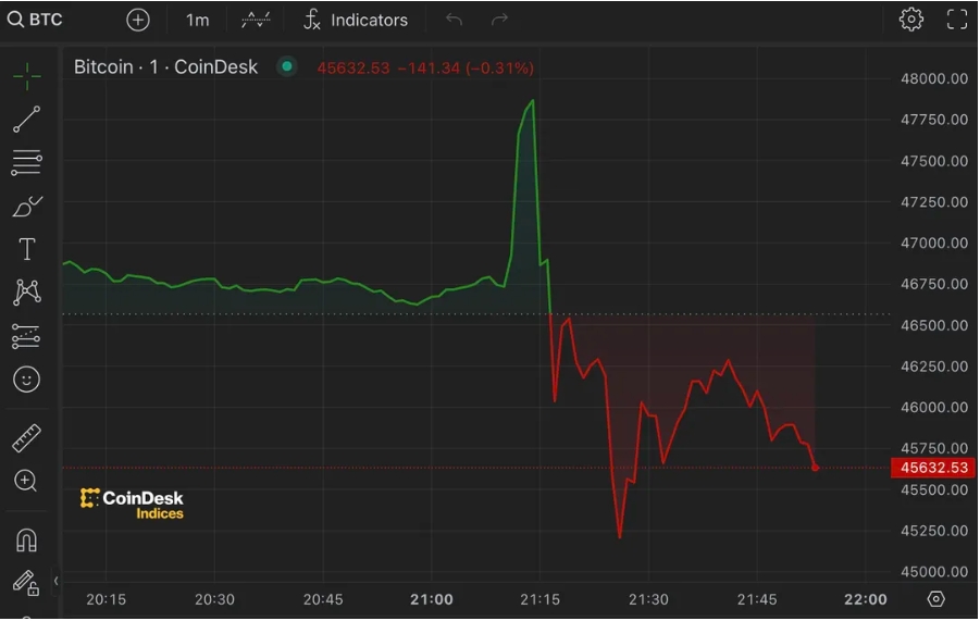 尽管 SEC 的虚假帖子只发布了几分钟便被删除,但它仍然成功引发了比特币价格的大幅上涨,使其从 46746 美元左右一度上涨至 47863 美元。在詹斯勒澄清后,比特币价格又瞬间回落,截至发稿,已跌回46122美元。