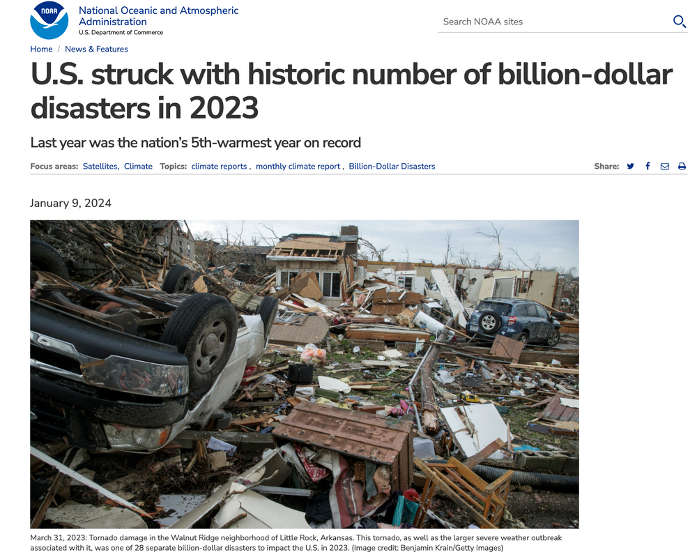 “2023年美国遭受的损失达10亿美元以上的灾难比有记录以来任何一年都要多,这凸显了气候变化带来的风险越来越大。”美国国家海洋和大气管理局NCEI主任Deke Arndt表示。“创纪录的热浪、干旱、野火和洪水清醒地提醒我们,我们正在全国各地看到长期变暖趋势的后果。”