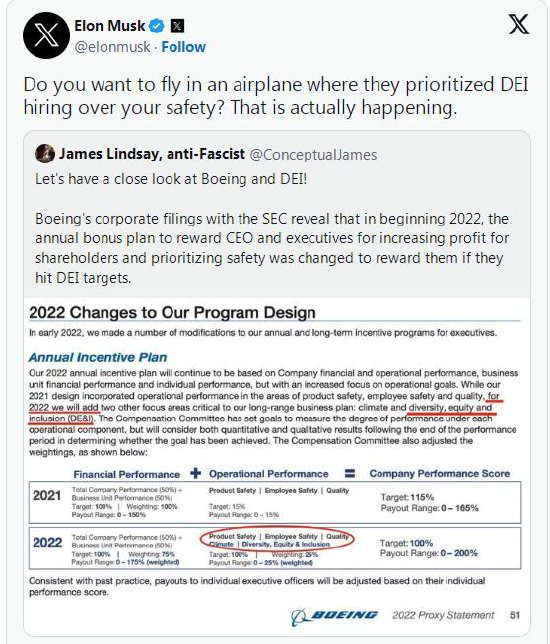 马斯克在转发一位用户的帖子时写道:“你想乘坐一架他们优先考虑DEI招聘而不是你的安全的飞机吗?”这位用户指出,波音公司在2022年改变了招聘政策,将多元化、公平和包容(DEI)纳入其中。