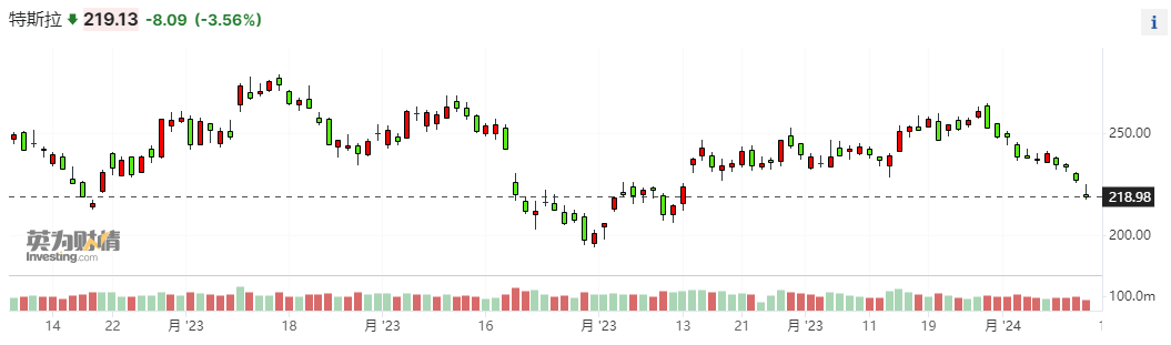 周五(1月12日)美股盘中,特斯拉股价一度跌3.7%最低报每股217.35美元,为2023年11月13日以来的最低水平。并且自2024年以来,特斯拉只有一个交易日录得上涨,年初至今已累跌超11%。