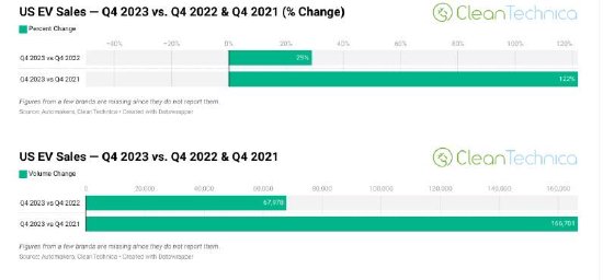 根据专注于清洁技术和可再生能源行业的网站CleanTechnica的数据,美国电动汽车市场正继续增长,这与许多头条新闻暗示的需求放缓相反。与2022年第四季度相比,第四季度美国纯电动汽车销量增长了29%。与2021年第四季度相比,销量增长了122%。