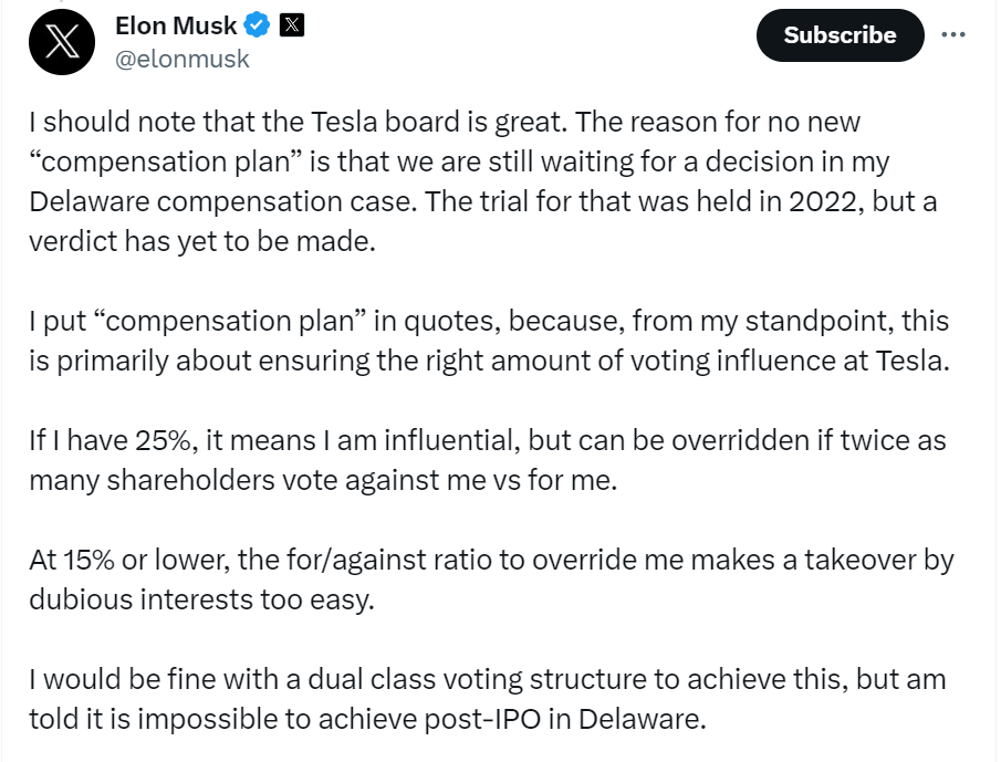 作为特斯拉最大的单一股东,马斯克没有更详细阐述他的想法。这位世界上最富有的人正在努力应对股东对一系列问题的不满,从特斯拉的继任CEO计划,到他被他在X的工作分散了注意力的指责。