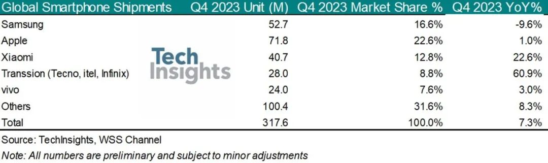 TechInsights预计,2023年全年全球智能手机出货量11.522亿部,同比下降3.8%。三星以19.6%的市场份额保持领先地位,苹果(AAPL.US)以18.8%的市场份额紧随其后,这是苹果自2013年以来的最高市场份额。