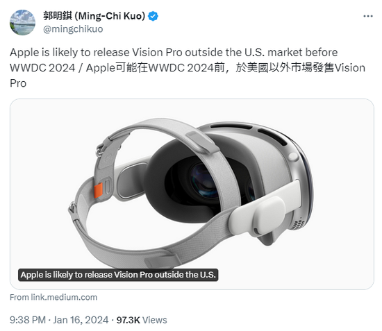 昨日,天风证券分析师、号称“地表最强苹果分析师”的郭明錤发文称,苹果可能会在2024年开发者大会(WWDC 2024)前在美国以外的市场发售Vision Pro。